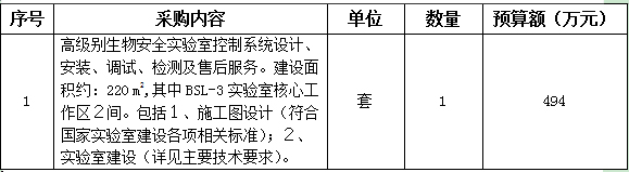 廣西壯族自治區疾病預防控制中心近期擬公開進行高級別生物安全實驗室控制系統采購,原預公告投送材料截止日期為2016年3月28日下午17:00,現將投送材料截止日期延長至2016年4月10日下午17:00,預公告內容增加主要技術要求。現將擬采購預算、采購內容與數量進行預公告(見下表)。歡迎擬參加投標的供應商投送資料,以便參考,供編制招標技術參數。
