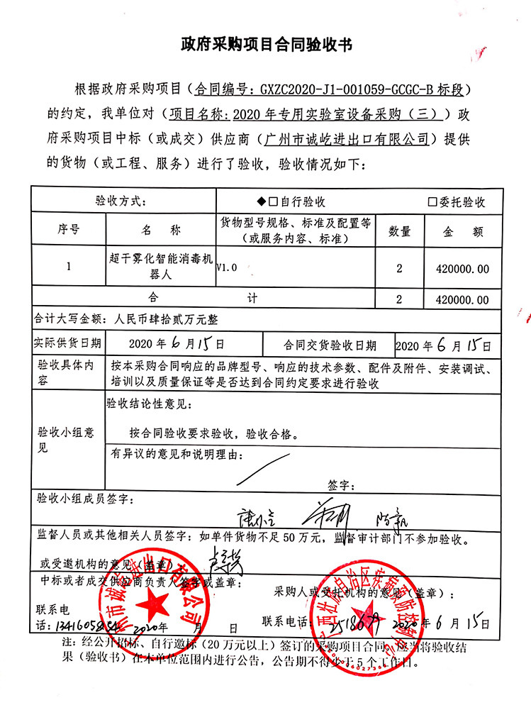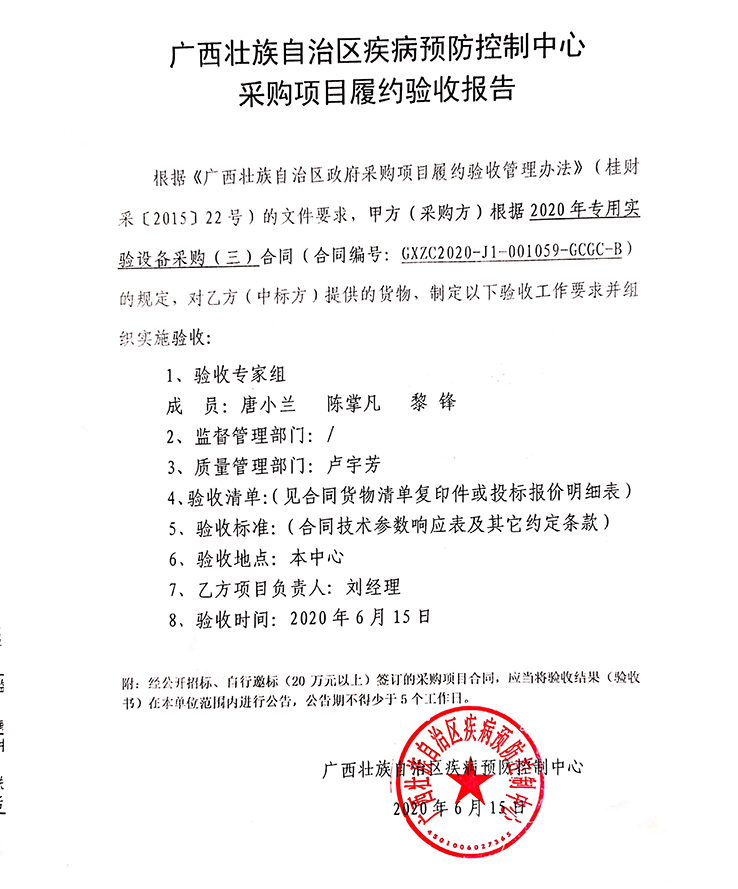 根據《廣西壯族自治區政府采購項目履約驗收管理辦法》(桂財采〔2015〕22號 )的文件要求,現將合同名稱:(GXZC2020-J1-001059-GCGC-B)的驗收情況公告如下: