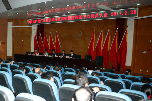 2011年2月28日,中共廣西壯族自治區疾病預防控制中心召開全體黨員大會,出席本次大會的領導有自治區衛生廳黨組成員副廳長梁遠,自治區衛生廳直屬機關黨委專職副書記梁毅以及中心在職共產黨員151名,離退休共產黨員48名。大會由中心黨委副書記紀委書記李永振主持,會議主要議題是進行中心黨委、紀委換屆選舉。大會選舉通過馬金玉、方鐘燎、呂煒、楊進業、楊益超、李永振、林 玫、卓家同、周艷、周昌明、梁江明(按姓氏筆劃排序)為中心第二屆黨委委員,李永振、姜世英、駱笑紅、黃兆勇、譚 毅(按姓氏筆劃排序)為中心第二屆紀委委員。會上中心黨委書記楊進業做《加強黨的組織建設,發揮黨的核心作用,推進廣西疾控中心工作全面發展》的黨委工作報告,全面總結近5年來中心黨委的主要工作和存在不足并對新一屆黨委工作提出設想。自治區衛生廳黨組成員、副廳長梁遠作重要講話,肯定中心黨委始終認真圍繞自治區黨委和政府賦予的疾病預防控制與公共衛生技術管理和服務職能所做的一系列工作,為我區衛生事業改革發展做出了積極的貢獻;對黨委的換屆工作提出要求:希望與會的同志能夠嚴格遵守黨章和黨內有關選舉工作條例規定,認真履行黨員的權利和義務,符合黨章規定,符合民主程序,代表絕大多數黨員的意愿;同時對選舉產生的新一屆委員會提出希望:希望繼續發揚過去的好經驗、好傳統、好作風,加強領導班子建設,著力提高黨員干部隊伍的綜合素質,始終堅持服務大局,全面做好疾病預防控制各項工作,持續推動創先爭優活動,努力開創疾控中心黨建工作新局面。自治區衛生廳直屬機關黨委專職副書記梁毅同志也作了指示。本次大會的召開是自治區疾控中心全體黨員政治生活中的一件大事,是新時期加強黨建工作的一項重要舉措,對于進一步加強疾控中心黨的思想、組織、作風和制度建設,促進疾控中心各項工作任務的完成,具有重要的意義。