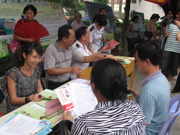 當天15點30分~17點,廣西衛生職業技術學院50名頭戴小紅帽的學生志愿者,來到南寧火車站、瑯東汽車客運站,向即將上車或剛下車的乘客宣傳煙草危害健康的知識,向乘客發放控煙宣傳單,勸阻在車站內吸煙的乘客不要在公共場所吸煙,并勸告他們戒煙。