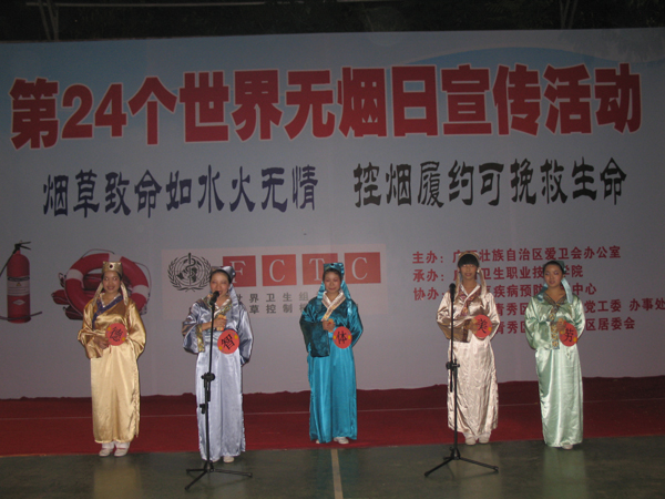 晚上19點30分,在廣西衛生職業技術學院的操場上燈火輝煌,人們歡聲笑語。南寧青秀區街道辦事外、桃源北社區的領導和幾百名居民、自治區愛衛辦、廣西CDC、南寧市愛衛辦、南寧市CDC等單位的領導和專家們歡聚一堂,在這里開展一場別開生面的控煙宣傳活動。該院的師生們通過文藝表演形式,宣傳控煙,受到觀眾的歡迎,會場不時報以熱烈的掌聲和歡呼聲。同時,他們還在晚會現場,開展控煙知識搶答活動,把會場活動氣氛推向高潮。據反映,這樣的控煙宣傳活動,達到了很好的宣傳效果。