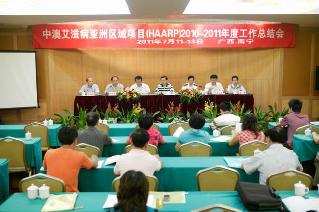 2011年7月12-13日,廣西中澳艾滋病亞洲區域項目(HAARP)2010-2011年度工作總結會議在南寧市桃源飯店舉行。自治區衛生廳國際合作處宮學林處長、衛生項目辦公室徐廣保主任、王海濤科長,自治區公安廳禁毒辦陳進才副主任、唐建忠科長、廣西警官高等專科學校朱其良教授和廣西區疾控中心紀檢書記李永振、艾滋病防制所副所長孟軍等人出席了會議。