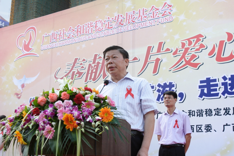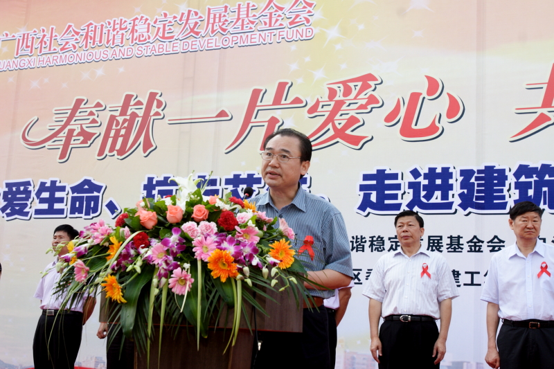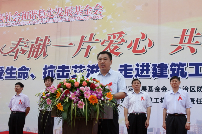 2011年8月4日上午,由廣西社會和諧穩定發展基金會、自治區防治艾滋病工作委員會辦公室、共青團廣西區委、廣西建工集團有限責任公司主辦的全區"珍愛生命 抗擊艾滋 走進建筑工地"行動啟動儀式在南寧舉行.廣西壯族自治區政法委溫卡華書記在啟動會上宣布全區"珍愛生命 抗擊艾滋 走進建筑工地"行動正式啟動,并向建筑工人代表贈送紅絲帶防艾健康包。