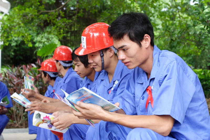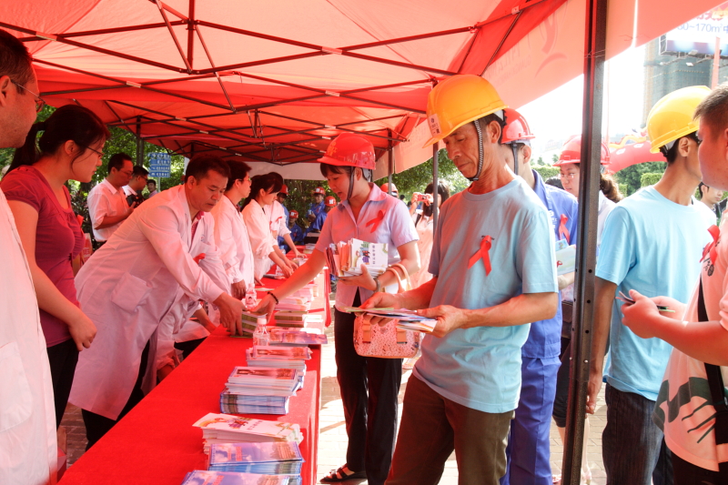 廣西CDC防艾專家給建筑工人發放防治艾滋病宣傳資料