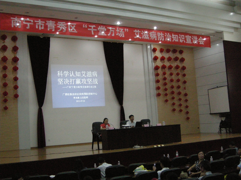 按照自治區防艾辦的統一部署,從今年4月開始在全區范圍內分別組建區、市、縣三級防艾宣講專家團,宣講師資共555人,其中自治區專家組共三十名,分成八組分別到14個地市和20個重點縣開展巡回宣講活動,將開展講座場次186場以上。宣講團第八小組主要負責南寧市六城區和賓陽縣、橫縣的11場宣講活動。宣講團副組長李永振主任醫師在宣講中深入淺出、圖文并茂給在場的干部群眾上了一堂堂生動的艾滋病防治課。通過介紹艾滋病基本概念、傳播方式、個人如何應對等防治艾滋病的核心信息,讓在場的干部群眾充分認識當前國家防治艾滋病的相關政策。李永振主任醫師根據不同的宣講對象,結合大量工作中的實例,以視頻、宣傳畫等多種方式進行授課,課堂氣氛活躍,受到了南寧市干部群眾的熱烈歡迎。西鄉塘區區委常委、宣傳部長、副區長李東紅認為,雖然城區也經常舉辦防治艾滋病知識講座,但本次自治區宣講團開展的防艾宣傳講座質量高,對促進城區防艾工作的開展起到了重要的指導意義,同時也對進一步深入扎實開展南寧市防艾攻堅工程,推動其科學、和諧、跨越發展,起到了很大的促進作用。