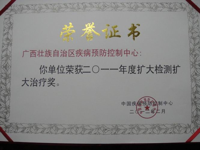 在2012年2月22—25日于成都召開的2012年全國艾滋病/性病/丙肝防治工作年會上廣西喜獲3項全國獎勵。獎項是根據《全國艾滋病性病防治主要措施落實質量的考評方案》的考評結果,國家疾控中心對全國部分成績優秀的單位授予頒發了獎狀。廣西疾控中心獲得了“二〇一一年度擴大檢測擴大治療獎”和“二〇一一年度艾滋病綜合防治示范區工作質量獎”;廣西皮膚病防治研究所獲得“二〇一一年度性病工作質量獎”。廣西疾病預防控制中心能獲此殊榮,是在自治區衛生廳的正確領導和各級領導的大力支持下,在全區各級防艾部門的積極配合及共同努力下取得的,是我區全體艾滋病防治工作人員的辛勤努力的結晶,是對我區艾滋病防治工作成績的肯定。廣西疾病預防控制中心將再接再厲,積極進取,指導全區各級疾病預防控制中心更好的完成和落實我區艾滋病防治各項工作措施,全面提升全區艾防工作質量,再創輝煌。