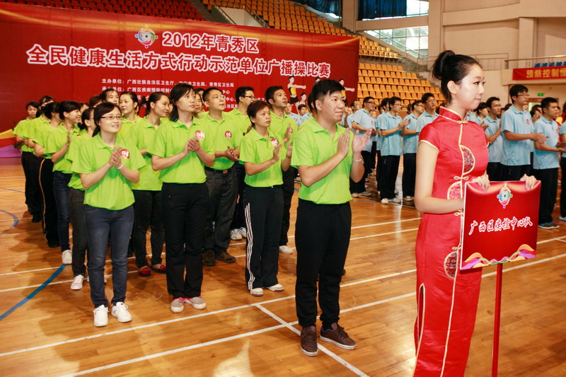 在活動現場同時舉辦了青秀區全民健康生活方式行動示范創建單位職工干部廣播體操比賽,本次廣播體操比賽采用的第九套廣播操保持傳統廣播體操特點的同時,引入了武術、踢毽、游泳、保齡球及現代舞等時尚運動的基本動作,突出了“健康、歡樂、易行”的風格。旨在推廣機關單位工間操制度,把身體活動與運動健身普及各種職業人群的生活中,在提高大眾對如何維持健康體重、控制血壓達標重大現實意義的認知水平的同時,養成良好的健身習慣,維持良好的健康生活方式。(自治區疾控中心慢病所)