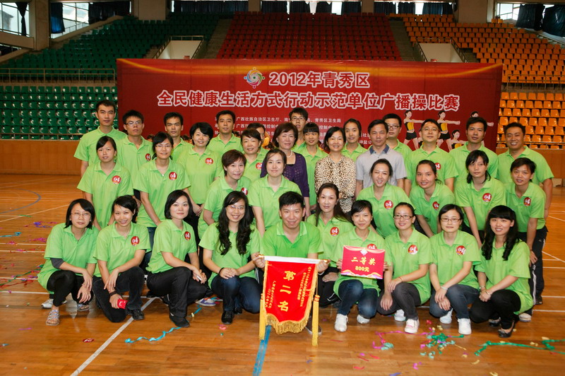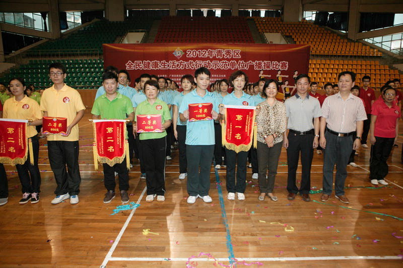 10月20日,自治區疾控中心組織30人的參賽隊到南寧三中逸夫體育館參加2012年全國高血壓日宣傳活動暨青秀區示范單位廣播操比賽,獲得第二名的好成績。本次活動由自治區衛生廳、南寧市衛生局、青秀區衛生局聯合舉辦,自治區衛生廳副廳長夏寧、疾控處處長陳發欽、自治區疾控中心副主任方鐘燎、南寧市鹽務管理局局長唐榮堯、南寧市衛生局副局長黎君君等領導蒞臨活動現場并觀賞了全程比賽,青秀區相關行政事業單位、社區居委會、社區衛生服務中心的干部職工和群眾共計約350人參加了當天的活動。
