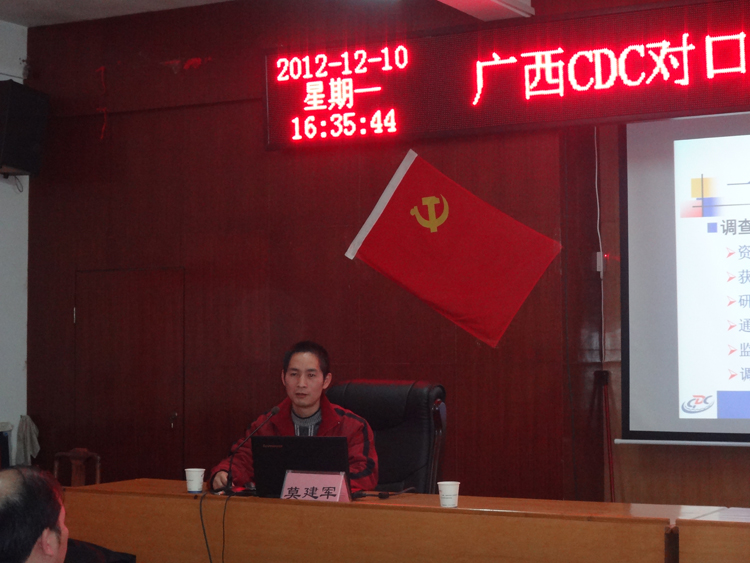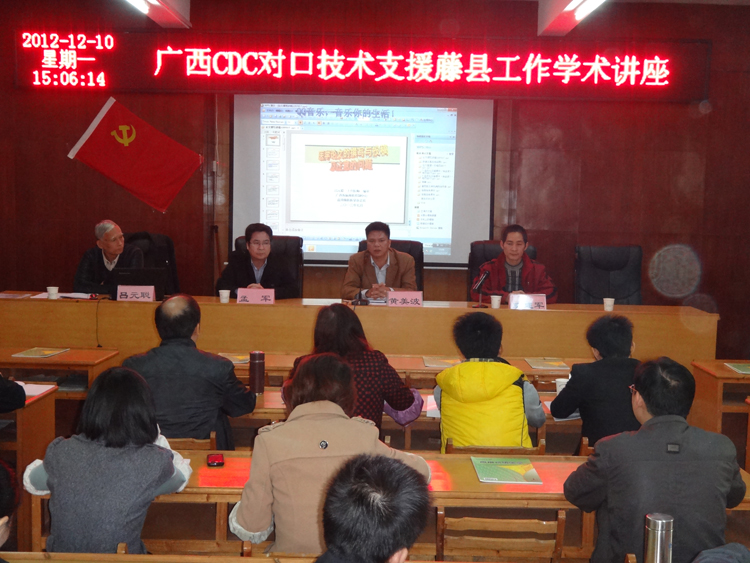 為落實中心對口技術支援工作,2012年12月10日,自治區疾控中心基本公共衛生服務項目技術管理科組織有關專家到藤縣CDC舉辦了一期關于論文撰寫和疫情調查處置等內容的對口技術支援工作學術講座,參加人員為藤縣CDC全體業務人員以及部分鄉(鎮)衛生院骨干共56人。