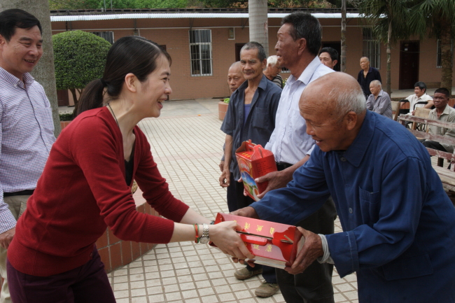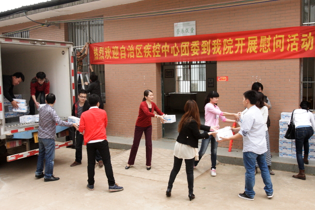 團員青年們的遠道而來受到了麻風病醫院患者及休養員的熱烈歡迎。廣西CDC團委譚宗艷書記首先代表廣西CDC團委向各位患者和休養員致以衷心的問候,希望他們堅定信心把病養好,同時祝福他們過的開心快樂,健康長壽;接著譚書記帶領團員青年將帶來的雞蛋、牛奶、面條等慰問品一一送到患者和休養員手中,團員青年樂觀向上的精神風貌和熱情洋溢的態度感染了每位患者和休養員,使他們深深感受到來自廣西CDC團委的溫暖。