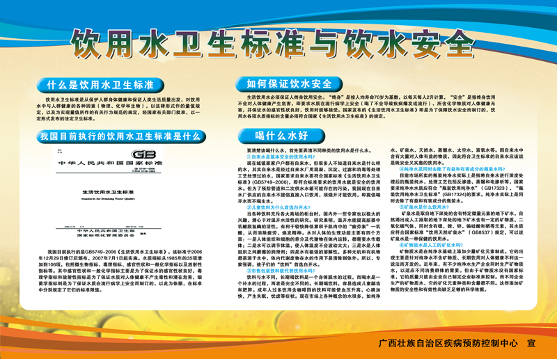 為廣泛宣傳飲用水衛生知識,增強全民飲用水衛生安全意識,努力營造全社會關心、支持和參與飲用水安全保障工作的良好氛圍,自2012年開始,我國把每年5月的第三周定為“飲用水衛生宣傳周”,今年是開展全國飲用水衛生宣傳周的第二年。今年的飲用水衛生宣傳周活動的主題為“科學認識飲用水,健康惠及千萬家”。根據《國家衛生和計劃生育委員會辦公廳關于開展2013年飲用水衛生宣傳周活動的通知》(衛辦監督函〔2013〕291號)要求,廣西疾病預防控制中心將活動周期間開展相關宣傳活動。重點宣傳飲用水衛生知識、飲用水衛生有關法律法規和標準,同時制作飲用水衛生宣傳展版、印發飲用水衛生宣傳資料,深入社區設點接受群眾飲用水衛生有關問題咨詢,通過宣傳引導群眾形成科學的飲用水衛生安全理念和正確的飲用水安全行為。