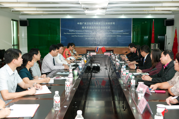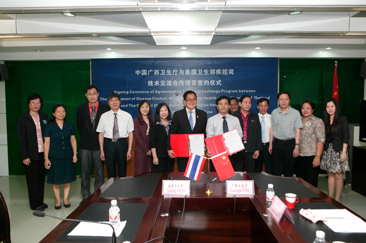 2013年7月22日,自治區衛生廳與泰國衛生部疾控司正式簽訂《中國廣西衛生廳與泰國衛生部疾病控制司技術交流項目協議》。自治區衛生廳副廳長梁遠,泰國衛生部疾控司司長Porntep Siriwanarangsun代表雙方簽訂協議。簽約儀式在我中心會議室舉行,由自治區衛生廳疾控處處長陳發欽主持,國際合作處處長宮學林,廣西區疾病預防控制中心主任唐振柱、副主任林玫等陪同參加簽約儀式,廣西疾控中心相關業務和職能科所人員參加了簽約儀式。