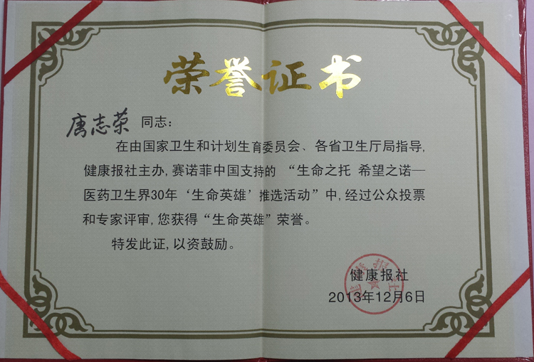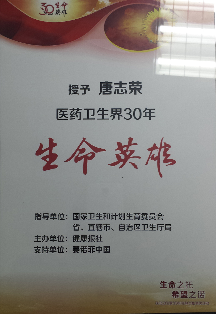 “生命之托·希望之諾——醫藥衛生界30年‘生命英雄’”頒獎活動于12月6日在京舉行。30位來自全國醫衛界的學者、醫生、公衛人員、基層醫務人員接受了衛生計生委宣傳司有關負責人、賽諾菲中國代表等頒獎嘉賓頒發的“生命英雄”的榮譽獎牌。我中心的唐志榮醫師(已故)獲得了此項榮譽。