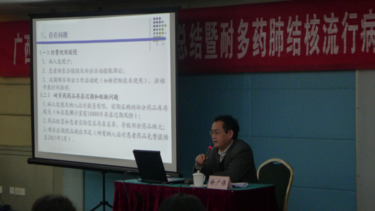 研討會上,徐廣保主任對廣西前期的全球基金項目耐多藥肺結核防治領域工作進行總結,并部署了下一步項目工作重點:1.積極推廣項目經驗。將先進的項目管理和診斷治療經驗在全區推廣,促進非項目地區盡快啟動耐多藥肺結核防治工作。2.確保耐多藥肺結核防治工作可持續發展。3個項目點的耐多藥篩查數據提示,廣西的耐多藥結核病疫情不容樂觀,防治工作任重道遠。在今年6月全球基金項目結束后,各地應該積極籌措防治經費,結合新農合、城鎮醫保等保障體系,持續開展耐多藥肺結核的診療和管理工作。