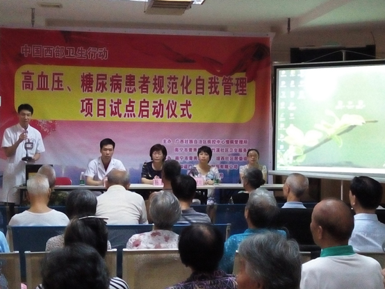 根據《2014年西部衛生行動(WAHI)》項目中對高血壓、糖尿病患者規范化管理及自我管理的試點項目要求,經過確定項目試點單位、招募社區慢性病患者自我管理入組人員等一系列前期籌備工作,廣西于2014年7月28日和29日分別在開展項目活動的柳州市柳北區雅儒社區衛生服務中心和南寧市青秀區竹溪社區衛生服務中心啟動了2014年世界衛生組織西部衛生行動(WAHI)項目社區慢性病患者自我管理試點項目工作。自治區疾控中心慢病所楊虹所長及相關項目工作人員參加了兩地的社區衛生服務中心的項目啟動儀式,兩地城區衛生局分管領導,市級和城區疾控中心的相關人員、社區衛生服務中心的上級指導醫院分管領導參加了各自轄區內的項目啟動儀式,同時有來自社區的近40名已招募入組的高血壓、糖尿病患者參加了啟動儀式。