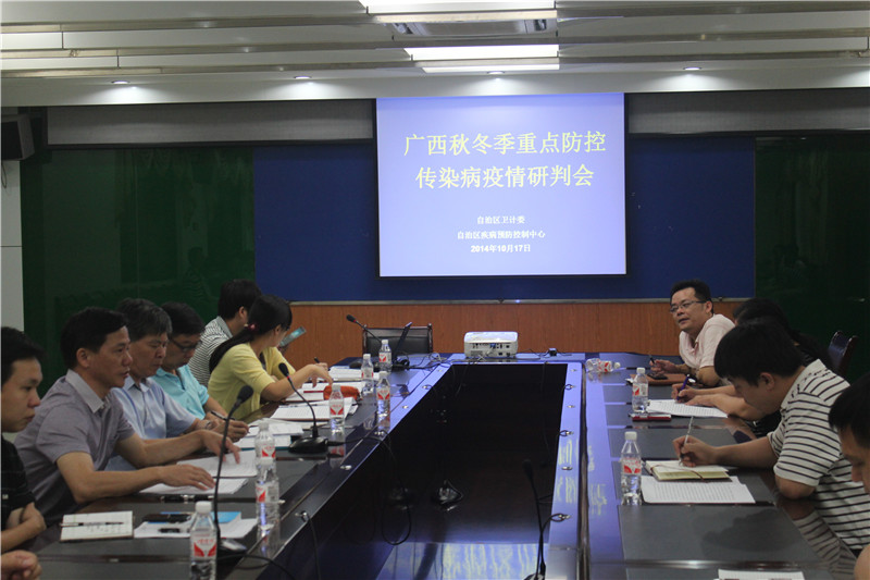 為貫徹落實國家衛生計生委關于加強2014年秋冬季重點傳染病防控工作的要求,自治區衛生計生委于2014年10月17日在自治區疾控中心召開了2014年秋冬季全區重點防控傳染病疫情研判會,自治區衛生計生委疾控處陳發欽處長、應急辦呂向劼主任科員、自治區疾控中心、南寧市疾控中心及南寧市第四人民醫院等有關領導、專家和專業技術人員共38人參加了會議。