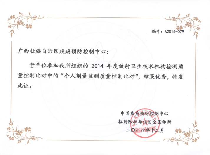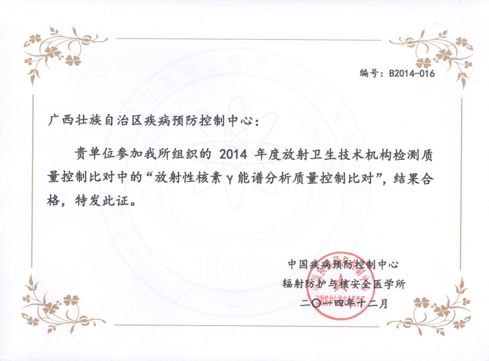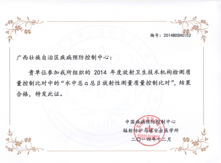 在2014年全國放射衛生技術機構檢測質量控制比對考核中,放射衛生防護所參加了3項比對,取得了“個人劑量監測質量控制比對”結果優秀、“放射性核素γ能譜分析質量控制比對”結果合格、“水中總α總β放射性測量質量控制比對”結果合格的好成績。廣西區疾控中心放射衛生實驗室的檢測能力位于全國放射衛生技術機構前列。