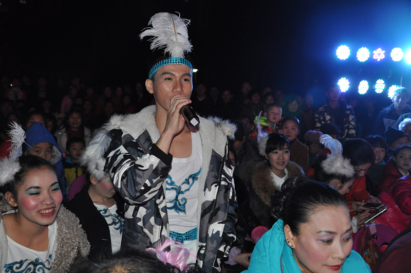 晚上7點30分,隨著悠揚的樂曲和歡樂的歌聲,青年男女登上舞臺,翩翩起舞……文藝表演節目豐富多彩,那充滿新春氣氛的快樂舞蹈、驚險刺激的單車表演等節目,博得上千觀眾的陣陣掌聲。