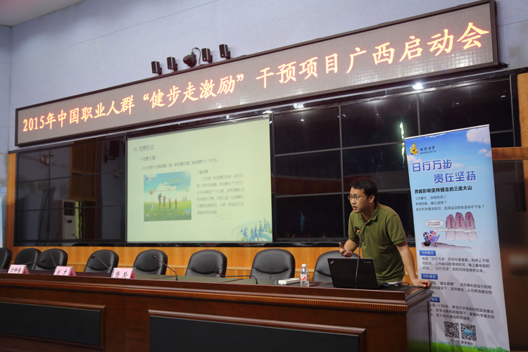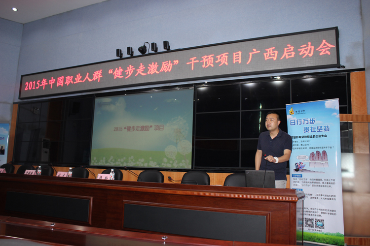 5月13日上午,2015年中國職業人群“健步走激勵”干預項目啟動會在自治區疾控中心啟動。自治區疾控中心副主任方鐘燎,南寧市青秀區疾控中心副主任楊玲,萬步網劉力老師出席了啟動儀式。啟動儀式由自治區疾控中心慢病所毛瑋副所長主持。
