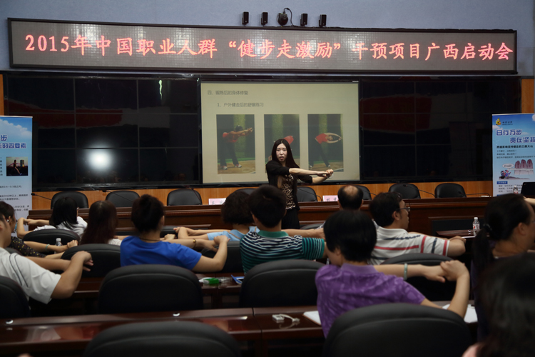 啟動儀式上,自治區疾控中心副主任方鐘燎致辭,列舉身邊的例子說明當前慢行病的嚴重性,指出,缺乏運動是慢性病發生的主要危險因素之一,而“健步走”是一種成效明顯、安全性高、適宜人群廣泛,且能長期堅持的運動方式,對控制體重、降低重要慢性疾病患病風險有顯著的效果。職業人群作為我國的主體人群,一半以上的工作是以坐和站立為主,缺乏有效身體活動尤為突出,在職業人群中探索有效的身體活動干預激勵模式有著極其重要的社會意義。讓職業人群真正“動”起來,讓愛運動、愛健康成為一種生活與工作的新常態意義重大。萬步網劉力老師作了“2015年‘健步走激勵’項目”介紹,向大家講解了運動健身常見的困難、萬步走的不同階段、團隊健走等內容。萬步網劉昌明老師對項目的競賽規作了詳細介紹。萬步網專業教練焦靜為大家講解了科學健走的動作要領和健走過程中的注意事項。