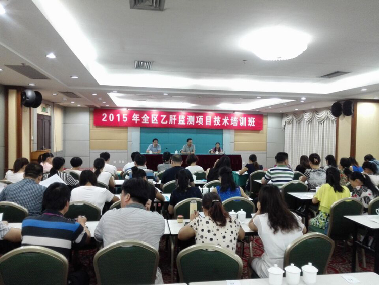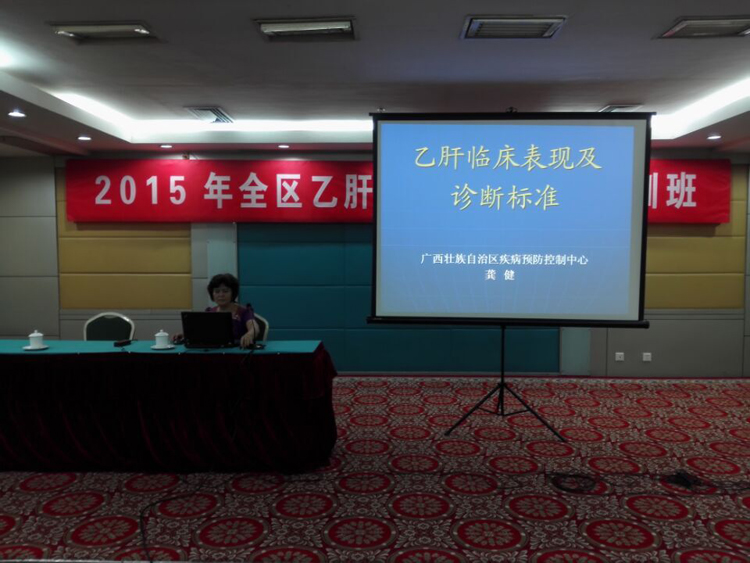 培訓班上,自治區疾控中心疫苗臨床研究所龔健主任醫師就乙肝的臨床表現及診斷標準進行了詳細的講解;免疫規劃所鄧秋云副主任醫師對2014年全國及廣西乙肝監測工作進展進行了通報并部署了2015年下半年工作要求,韋敬航技師介紹了乙肝實驗室檢測及送樣要求。
