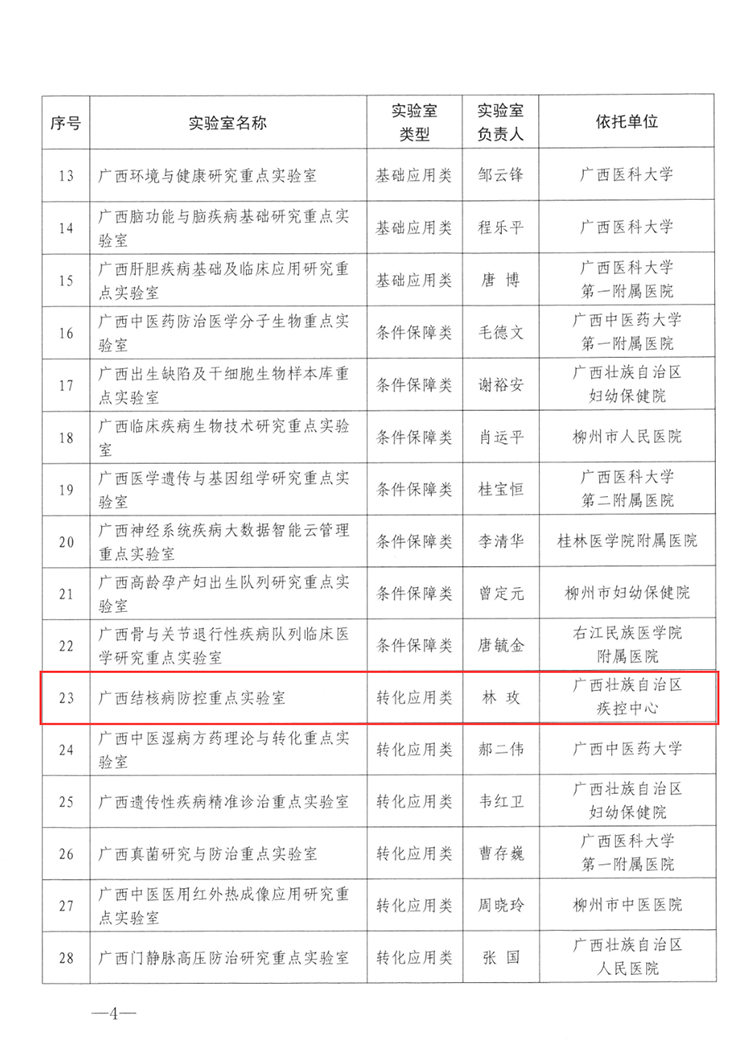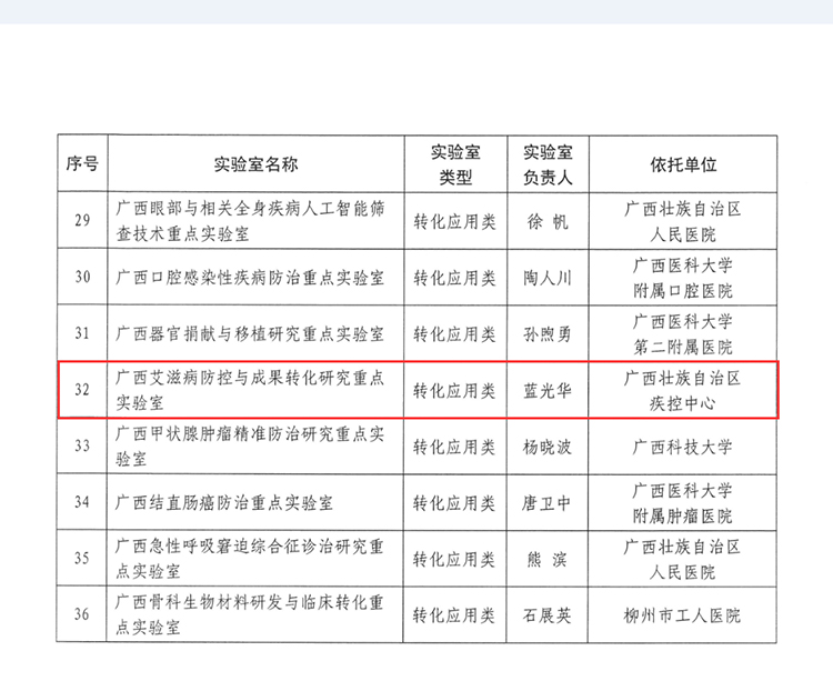 結核病防控重點實驗室旨在研究廣西結核病防控關鍵技術,加強結核病發現和管理水平,以有效控制我區結核病流行。艾滋病防控與成果轉化研究重點實驗室聚焦廣西艾滋病病毒亞型和亞族的流行規律、HIV耐藥發生和傳播水平及關鍵性影響因素,為艾滋病精準防控提供技術與策略。