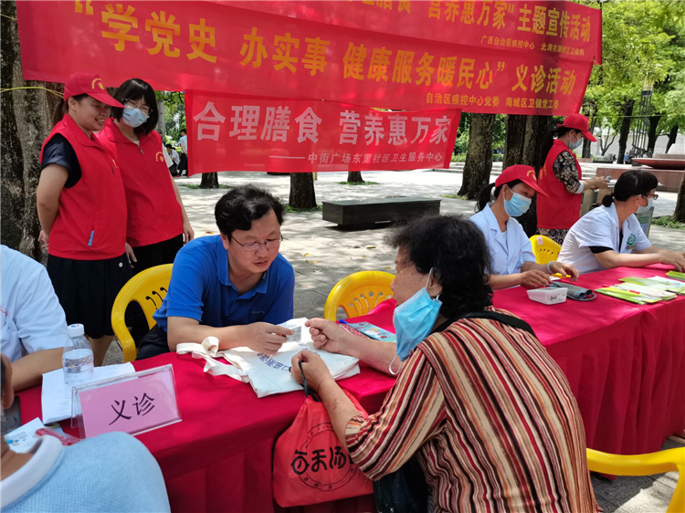 5月21日,自治區疾控中心還和海城區基層醫療衛生機構組成聯合專家團隊在北海北部灣廣場舉行“學黨史 辦實事 健康服務暖民心”義診活動。專家團隊就居民常見病、慢性病防治以及健康飲食等問題進行義務咨詢指導,普及合理膳食相關知識技能,倡導健康生活方式,引導大眾養成“三減”健康飲食習慣,倡導分餐制和使用公勺公筷等飲食風尚,擯棄濫食野生動物的陋習,提高對食物營養、平衡膳食基本原則的認識,為群眾做量血壓等常見體檢和發放健康宣傳材料。